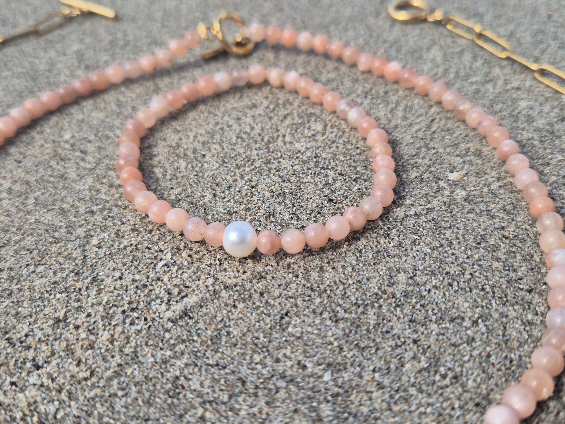 Delicate and luminous, the Gota de Sol bracelet feels like a drop of sunlight resting on the skin. Crafted with warm sun stone beads and finished with a single freshwater pearl, this bracelet embodies softness, femininity and quiet strength.